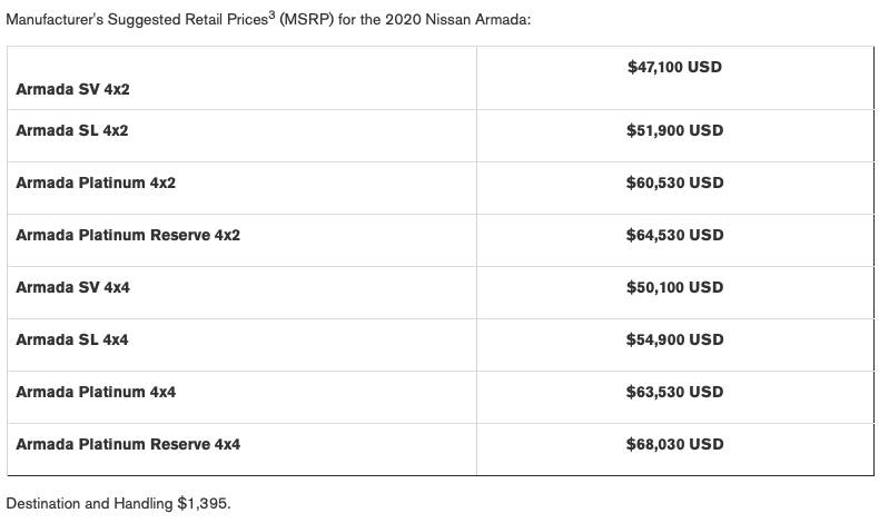 The 2020 Nissan Armada is available in four trim levels (SV, SL, Platinum, and Platinum Reserve), each of which offered with standard 2WD or available 4WD — a $3,000 option on each grade. The base SV 4×2 model starts at $47,100, accounting for a $310 increase over the 2019 Armada SV 4×2. The range-topping 2020 Armada Platinum Reserve 4×4 costs $68,030, up $2,340 compared to the equivalent 2019 model.