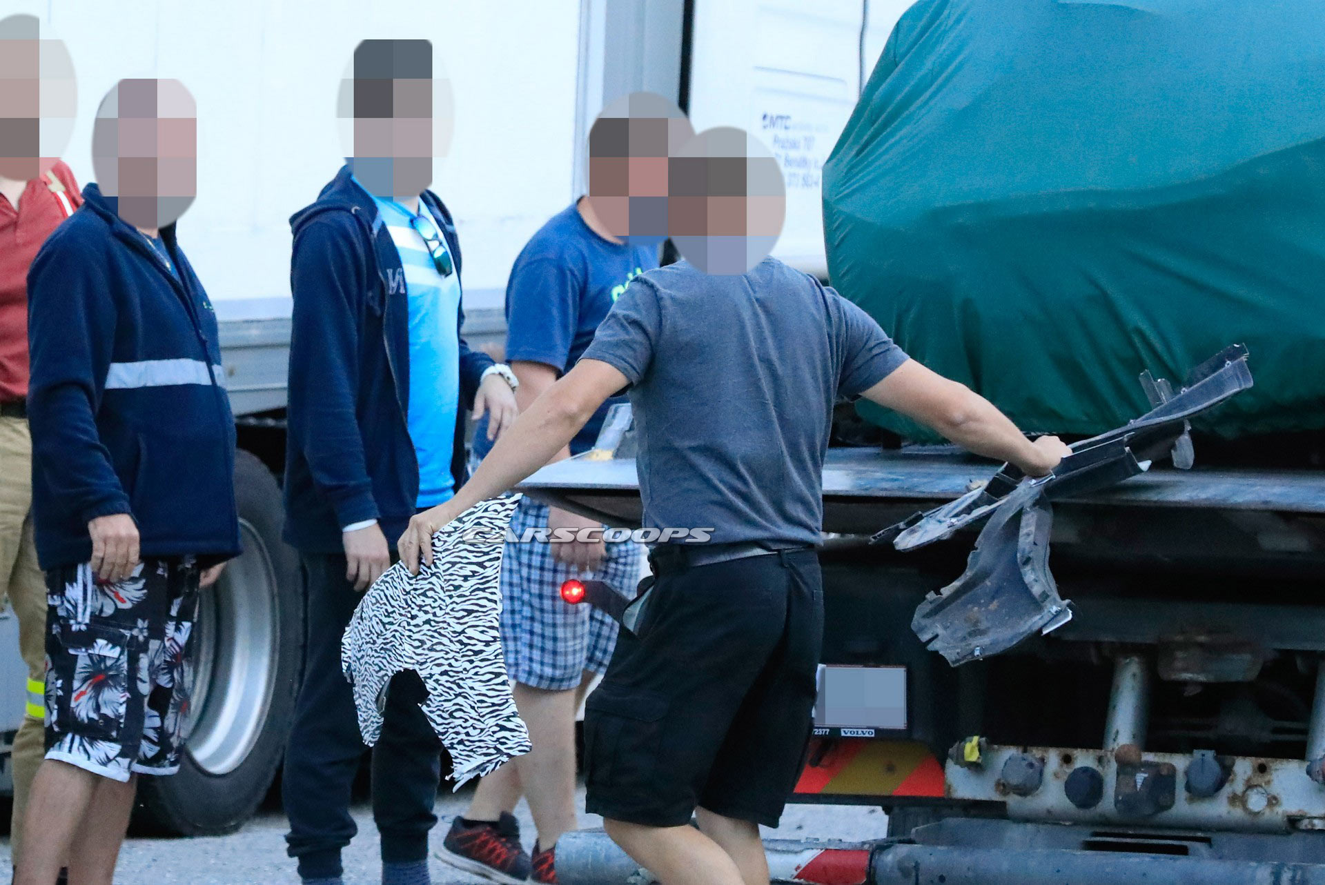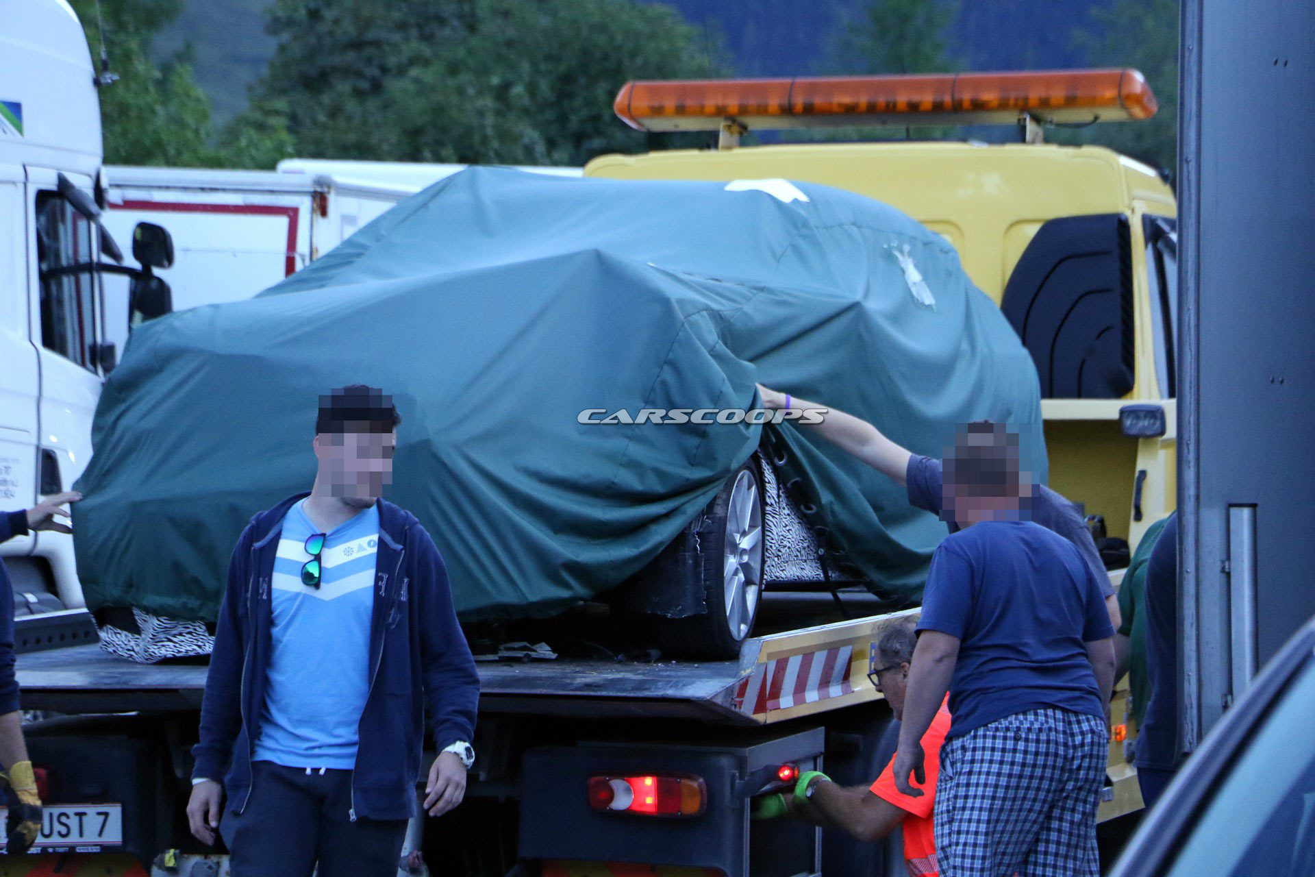 The prototype was quickly covered, but the damage was so extensive that it can be seen underneath the trap. In particular, the hood was peeled back and the entire front driver’s side of the car was destroyed. Workers were also photographed taking away pieces of damaged body panels.