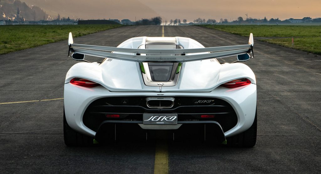 Koenigsegg also repeated that the upcoming Jesko should be capable of reaching over 300 mph (482 km/h) in its high-speed, lower-downforce version. Power for the Jesko is coming from a twin-turbo 5.0-liter V8 that can rev up to 8,500 rpm and produce 1,578 HP (1,600 PS) and 1,106 lb-ft (1,500 Nm) of peak torque when on E85.