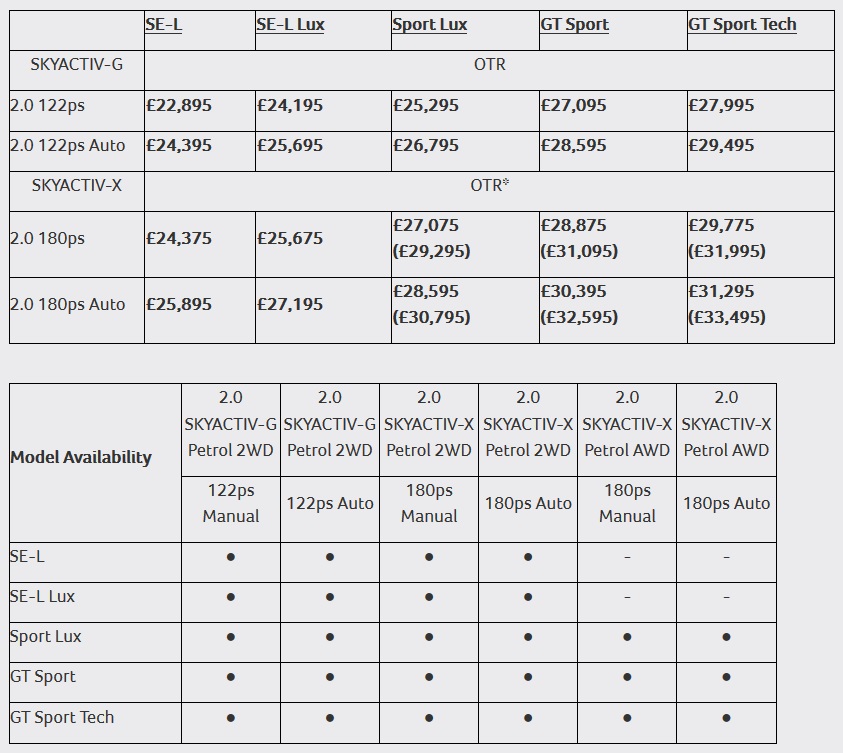 Bridging the gap between the CX-3 and the CX-5, the CX-30 is offered in five trim levels: SE-L, SE-L Lux, Sport Lux, GT Sport and GT Sport Tech. Pricing starts at £22,895 ($27,867/€25,315), £3,500 ($4,260/€3,870) more than the entry-level CX-3 and £2,705 ($3,292/€2,990) less than the larger CX-5.