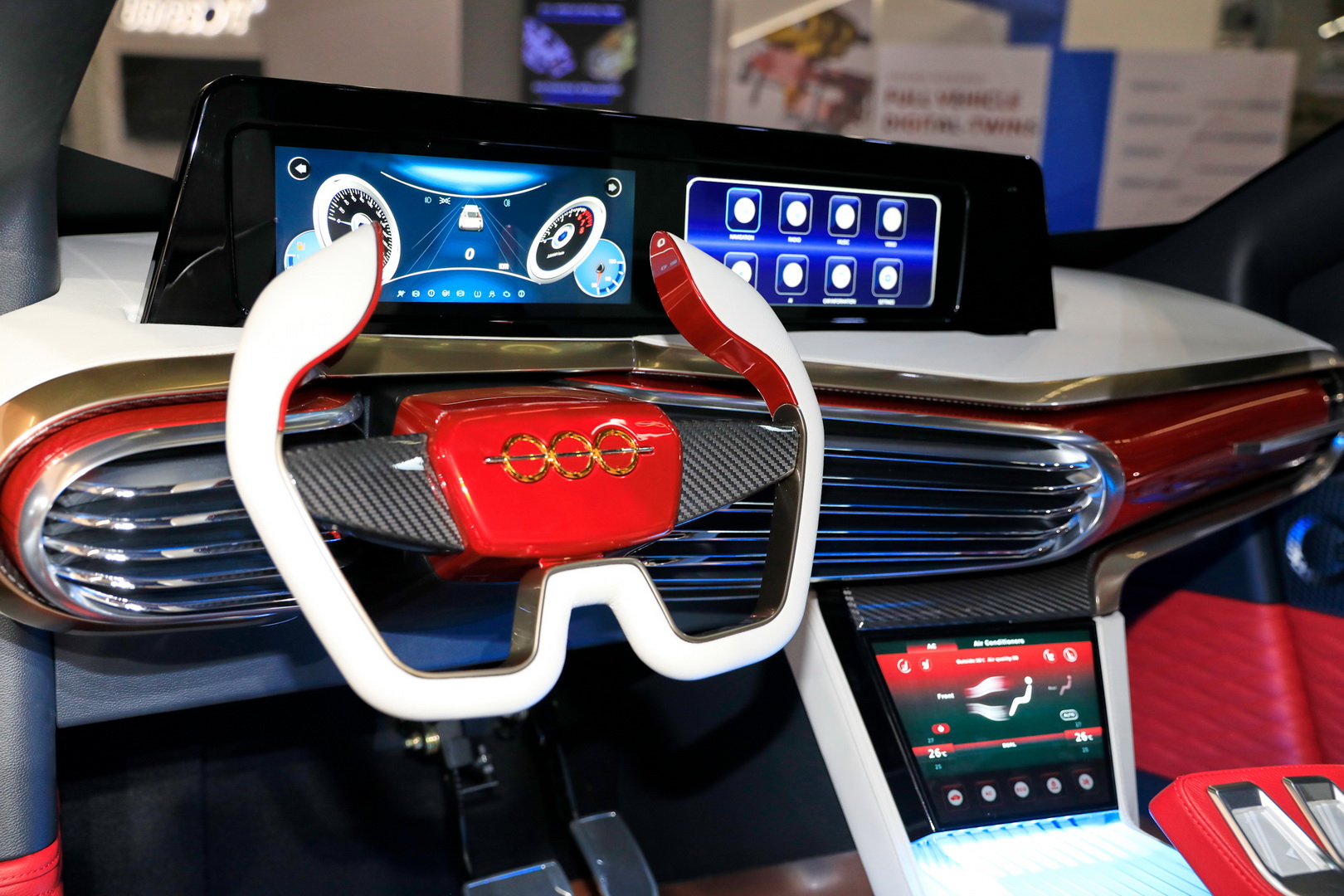 Having a dual-screen setup in the cabin, for the digital instrument cluster and infotainment system, would have normally been the major eye catcher. However, in an attempt to shock, they went for a weird mix of red, white, gold and chrome, mixed together with blue ambient lighting and sprinkled with wood and carbon fiber-like trim. It takes a while to spot other main features, like the third screen used to control the HVAC or four-seat layout.