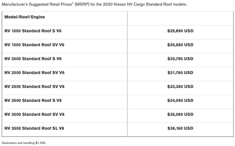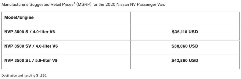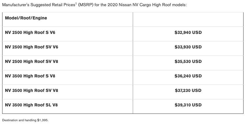 For some reason that Nissan did not communicate, the 2020 NV Cargo and 2020 NV Passenger have higher starting MSRPs than 2019 models.