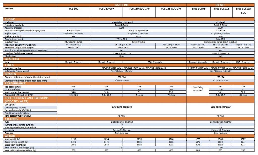 All engines are linked to six-speed manual transmissions, apart from the TCe 100 that comes with a five-speed unit and the top petrol engine which is mated to a seven-speed EDC dual-clutch transmission as standard (available as an option on the TCe 130).