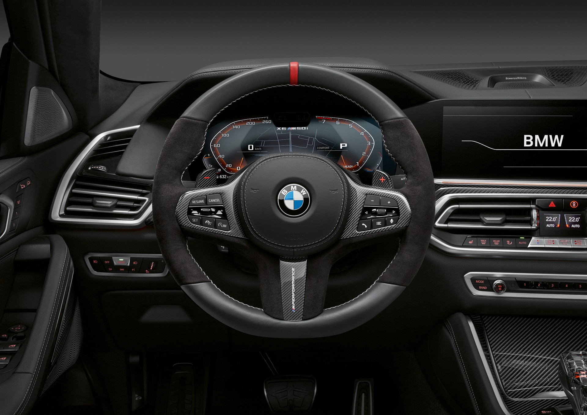 Moving into the cabin, the X5 M and X6 M can be outfitted with an M Performance steering wheel that features Alcantara grips and optional carbon fiber trim. This theme can be further enhanced by ordering “carbon fabric” paddle shifters. Rounding out the interior options are M Performance floor mats and stainless steel pedals for the X6 and X7. BMW describes them as a “very stylish motorsport-inspired extra.”