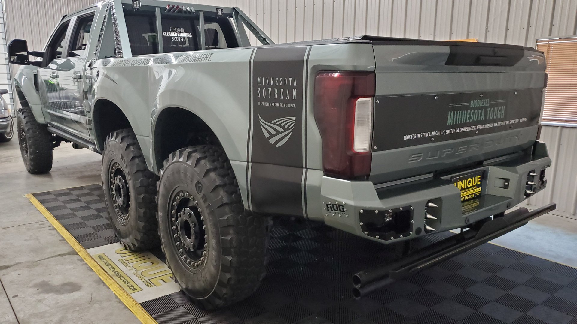 Made by Diesel Brothers for the Minnesota Soybean Research Council and featured on Discovery Channel’s reality show, the Indomitus (hard to get used to that name) boasts three fully functional axles. The Readylift suspension has added 7 inches (17.8 cm) to the ground clearance, there’s an adjustable four-link suspension setup while the truck rides on 40-inch tires, wrapped around the DBL wheels.