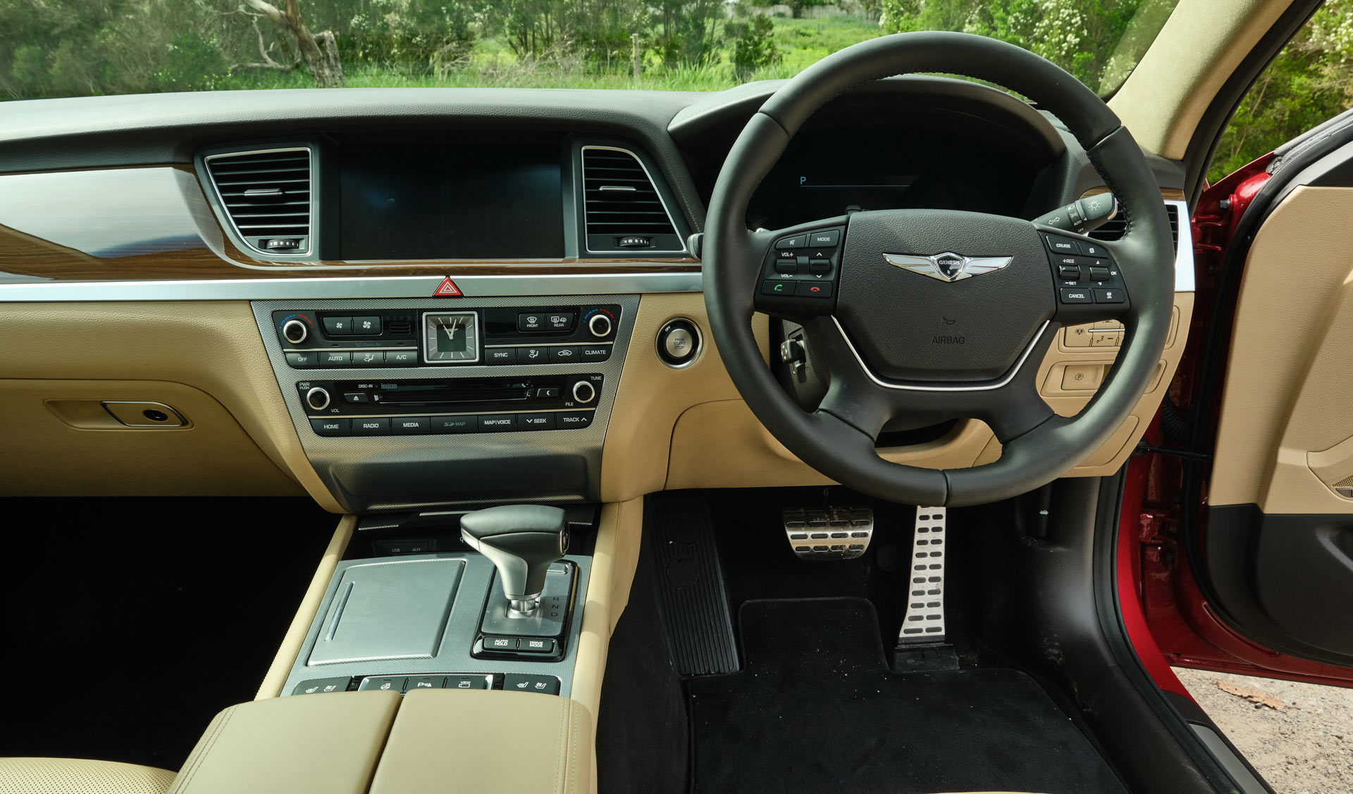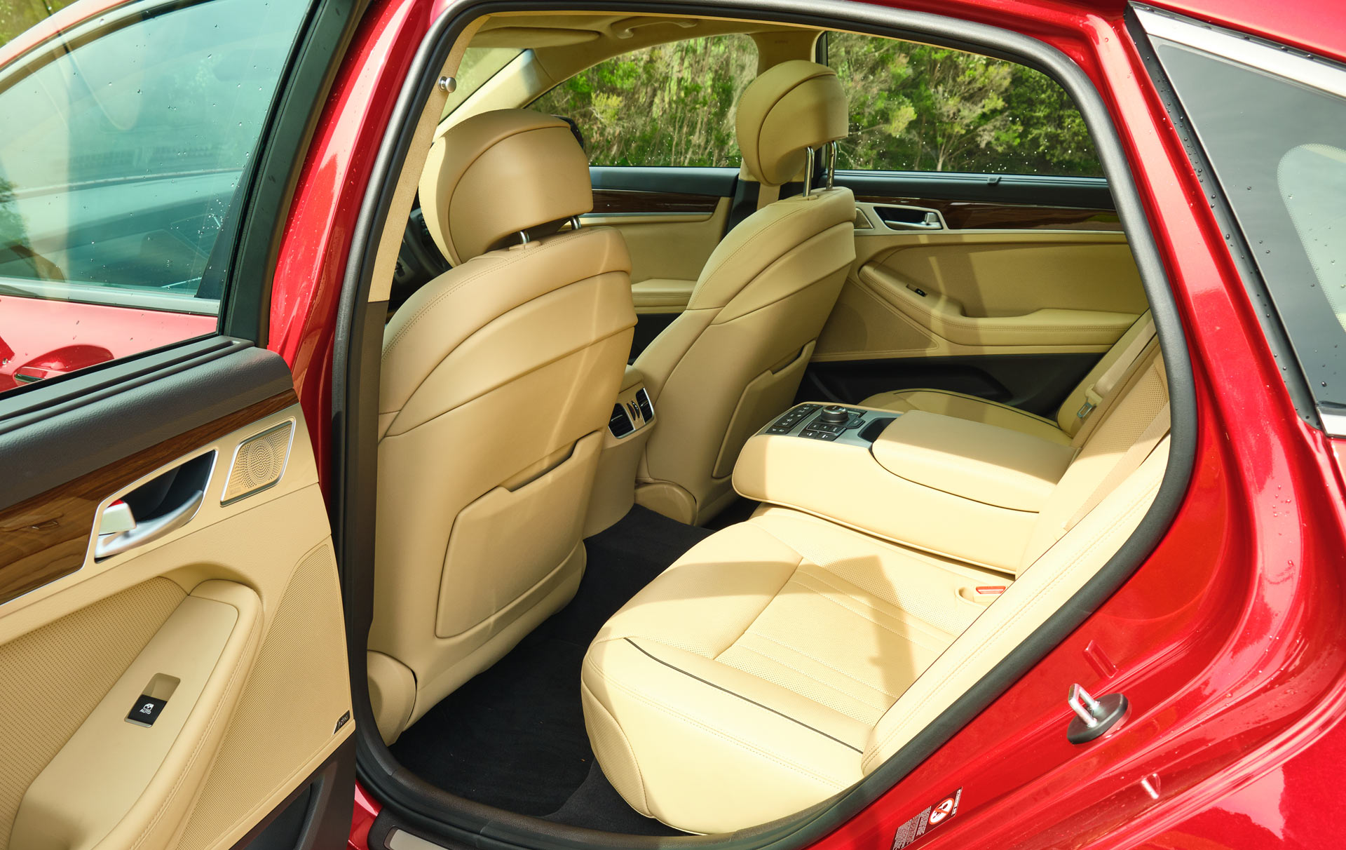 Moving to the interior, it is nice. Very nice in fact, regardless of whether you’re driving the G80, sitting in the front passenger seat or relaxing at the rear. All seats and numerous other surfaces are clad in plush Nappa leather and there is also a suede headliner. Adorning much of the dashboard and parts of the door panels is wood and there are a number of covered storage cubbies in the center console.