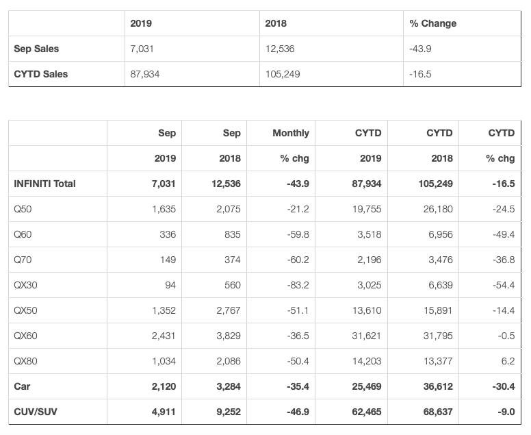 If you thought Infiniti’s sales results were probably an anomaly related to the month of September, think again. In the first nine months of 2019, Infiniti sold 87,934 cars and SUVs in the United States, compared to 105,249 units in the same period in 2018. That accounts for a 16.5 percent drop and, by the looks of it, the percentage could grow further for the entire calendar year.