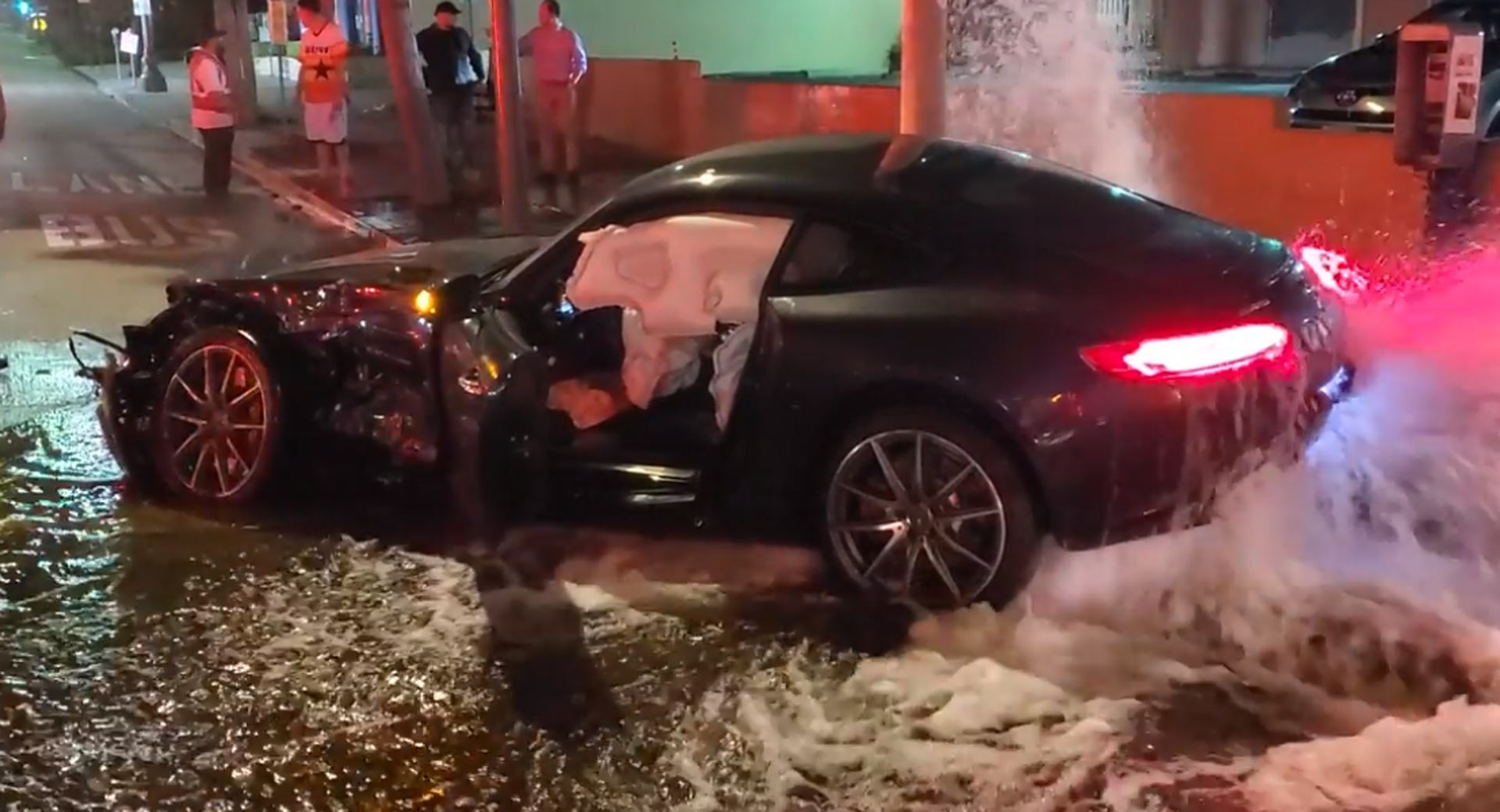 The owner of a Mercedes-AMG GT experienced first-hand the devastation water can cause to a car after crashing into a Range Rover and a fire hydrant in Koreatown, Los Angeles earlier this week.