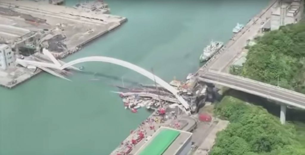 People watched in horror as an arch bridge collapsed into a harbor in Nanfangao, Taiwan on Tuesday.