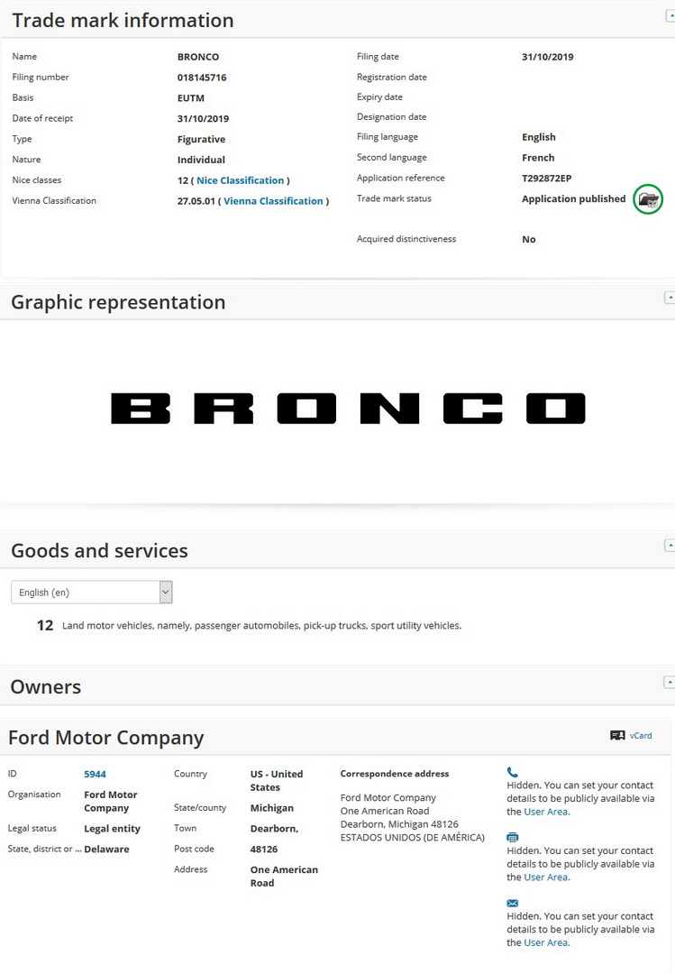 Filed with the European Union Intellectual Property Office (EUIPO) on October 31, the Bronco moniker can be used on “land motor vehicles, namely, passenger automobiles, pick-up trucks and sport utility vehicles”.