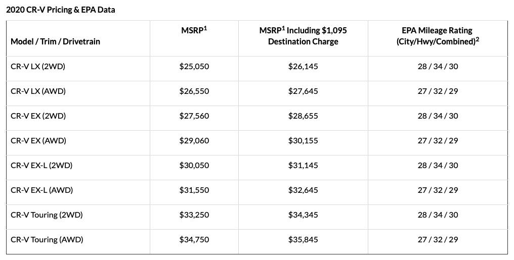 The updated 2020 Honda CR-V has begun arriving in U.S. dealerships this week so it’s time to take a look at the price list.