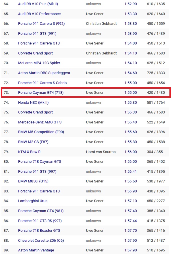 The 718 Cayman GT4 was equally fast to the 911 Carrera S Cabrio and nearly half a second slower than the Aston Martin DBS Superleggera. The (discontinued) McLaren MP4-12C Spider posted a time of 1:54.10 and the 991 GT3 did a 1:53.90.