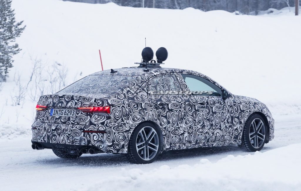 A camouflaged prototype of the sportier S3 Sedan model was also spotted during some cold weather testing, showcasing its slightly more aggressive styling under the traditional swirly wrap; changes over the non-S models include a different front bumper with sharper lines, bigger air intakes and a more pronounced front grille; deeper side sills; bigger wheels; and a rear bumper with an integrated diffuser and room for the quad exhaust pipes.