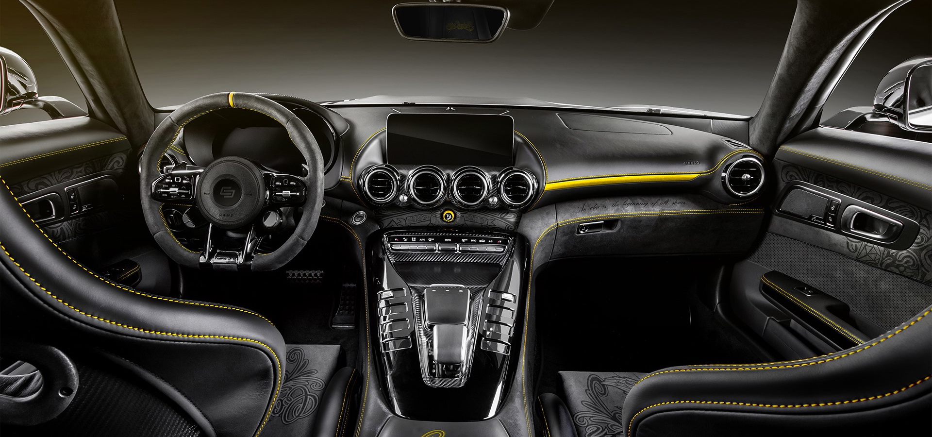 The cabin is adorned in various motifs, from the lower dashboard to the sports seats, door panels and center console. The steering wheel meanwhile is covered in Alcantara (much like the headliner and various other parts), while the entire cabin wears yellow as contrast stitching.