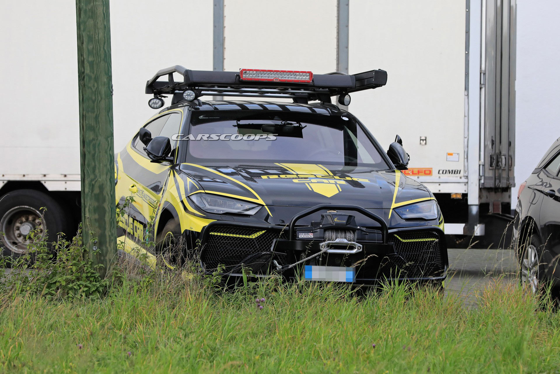 As you can see these spy photos, this heavily modified Urus is built for action as it has been equipped with a tubular front bumper and a Warn winch. Moving further back, there’s an eye-catching black and yellow paint job as well as matching two-tone wheels.