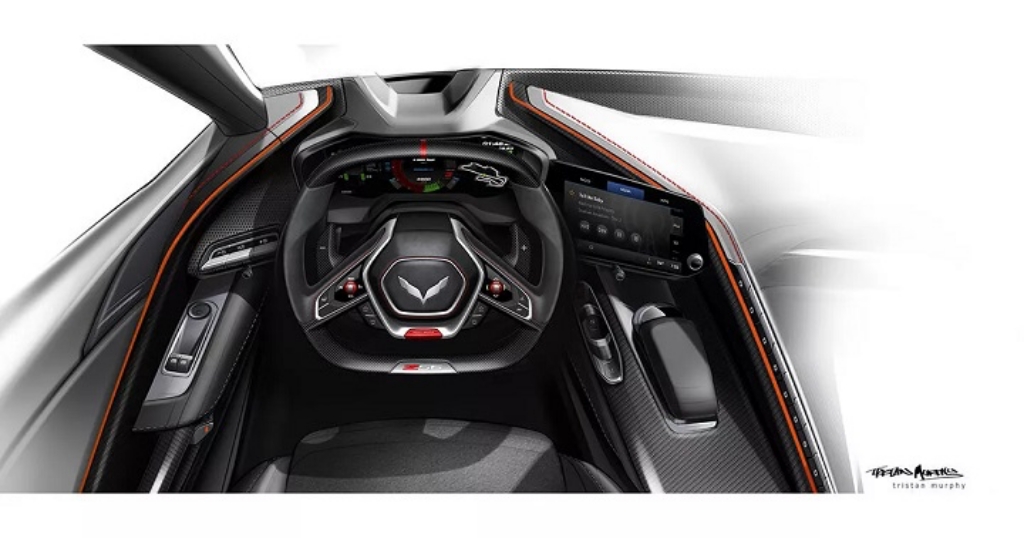 But the “base” Stingray is just the beginning and things can only get more interesting from here. Next in line is the Corvette Z06, the performance model rumored to pack around 800 horsepower from a 5.5-liter V8 with a flat-plane crankshaft. Little else is known about the mid-engined Corvette Z06 but now we can show you the first official sketch of the interior.