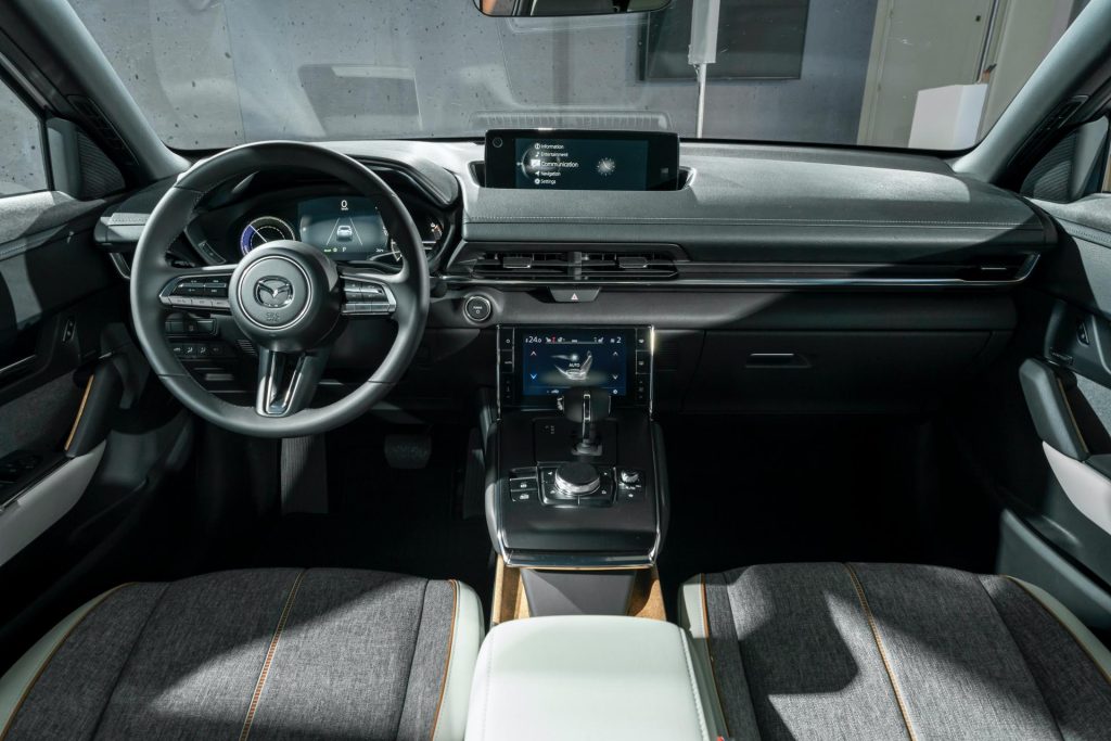 Styling-wise, the MX-30’s ‘Human Modern’ styling concept and Freestyle center pillar-less doors (with an 82-degree opening angle at the front and 80-degree at the rear) represent a new evolution for the Kodo design language. The highlight of the interior is the floating center console incorporating Mazda’s first touch-screen air-conditioning control panel (7 inches in size).