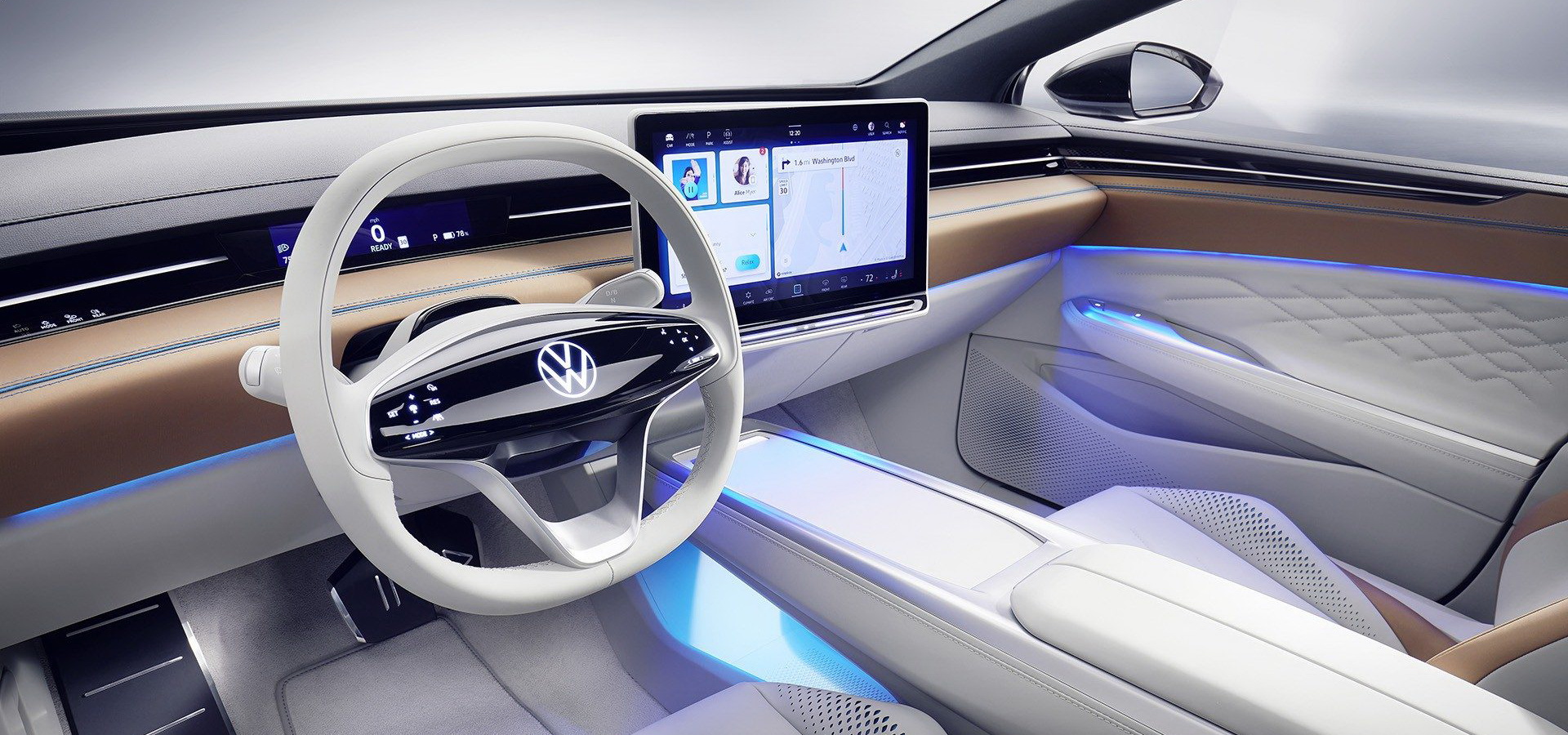 At the front, there are slender white light strips, an illuminated VW logo, IQ Light LED matrix headlights, honeycomb-style LED daytime running lights and of course, no radiator grille. Move to the side of the concept and you’ll notice that there are no door handles. Instead, the vehicle features illuminated touch surfaces that light up as soon as its Keyless Advanced function detects someone approaching with a vehicle key or a synchronized mobile key on a smartphone.