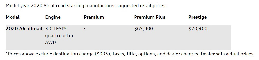 The 2020 Audi A6 Allroad will be available in two trim options -Premium Plus and Prestige-, with prices kicking off at $65,900, not including a $995 destination charge.
