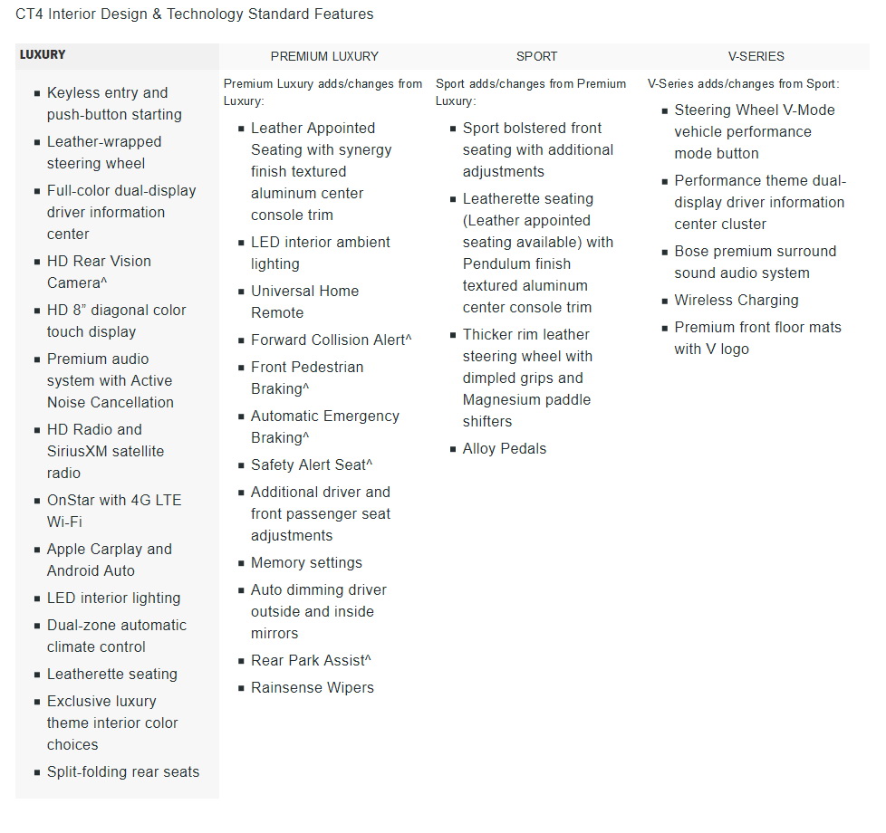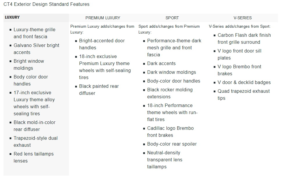 The new Cadillac CT4 will be available in Luxury, Premium Luxury, Sport and V-Series trims. Each one will be visually distinct, in addition to the traditional variations in standard equipment and powertrain choices.
