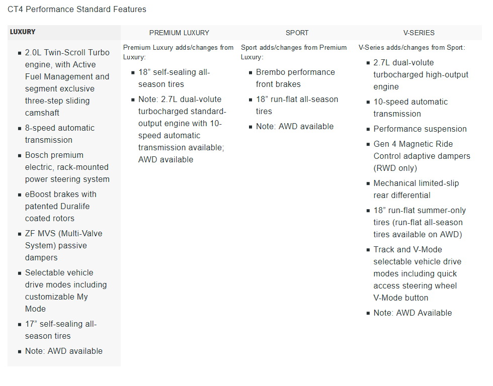 The base CT4 Luxury will be available only in the turbocharged 2.0-liter four-cylinder engine, which produces 237 HP and 258 lb-ft of torque. It is paired to an eight-speed automatic transmission and rear-wheel drive is standard, with AWD offered as an option.