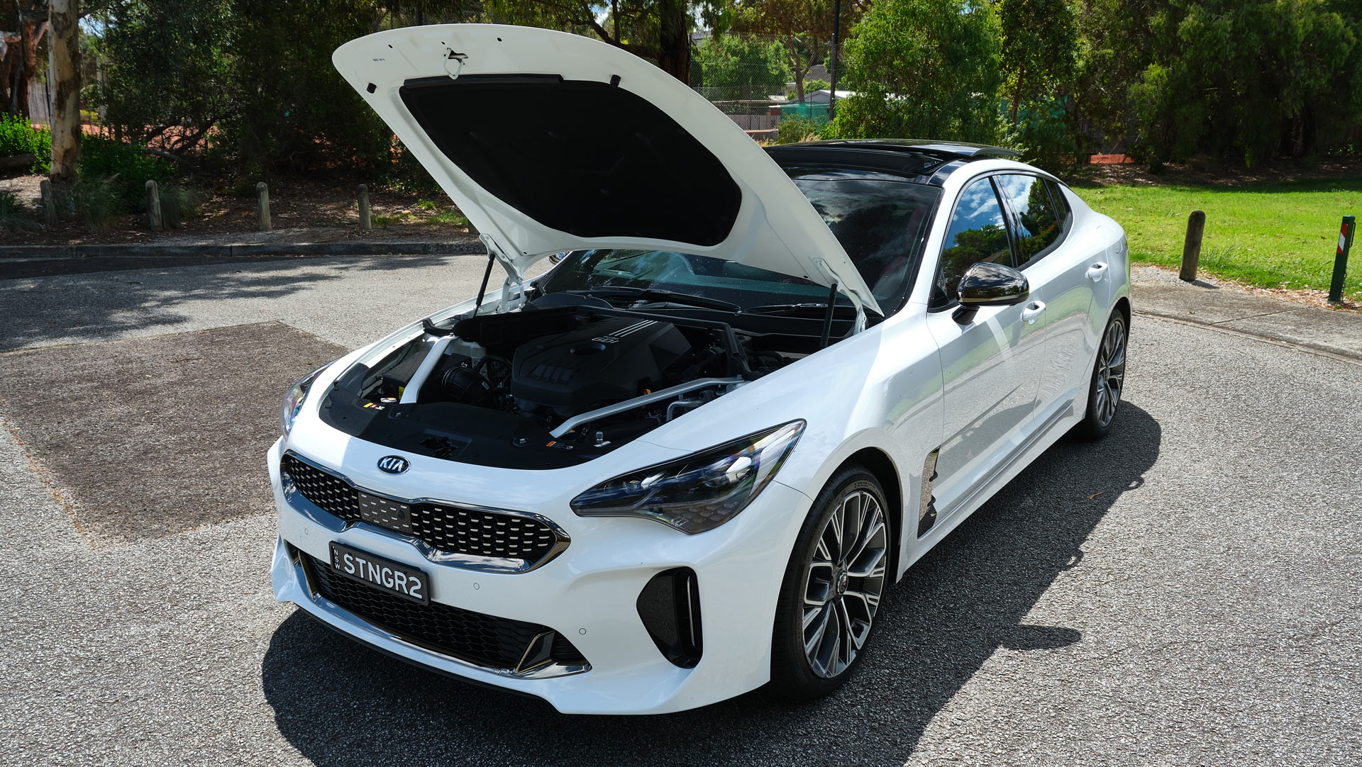 Safety and driver assistance systems are found in abundance. The Stinger GT-Line is equipped with seven airbags, a superb 360-degree camera system, rear-view camera, front and rear park sensors, lane-keep assist, radar cruise control, autonomous emergency braking, and a bonnet that pops up to protect pedestrians.