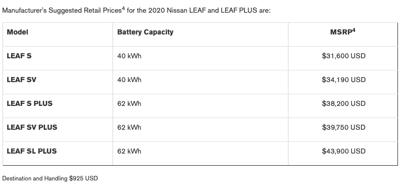 The base 2020 Nissan Leaf S with 147 HP and the smaller 40 kWh battery offering up to 149 miles (240 km) of range starts at $31,600 (excluding $925 destination). This means it’s $1,730 more expensive than the equivalent 2019 model.