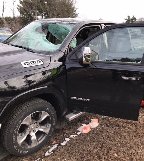 The ice sheet fell from the top of a box truck that was traveling ahead of the Ram 1500 on Route 3 in Burlington, Massachusetts. Also present in the pickup were the driver’s 38-year-old wife, their 3-year-old boy and 18-month female toddler. All of them were transported by ambulance to Massachusetts General Hospital, the man with serious injuries, the woman and boy with minor injuries, and the uninjured toddler for precautionary reasons.