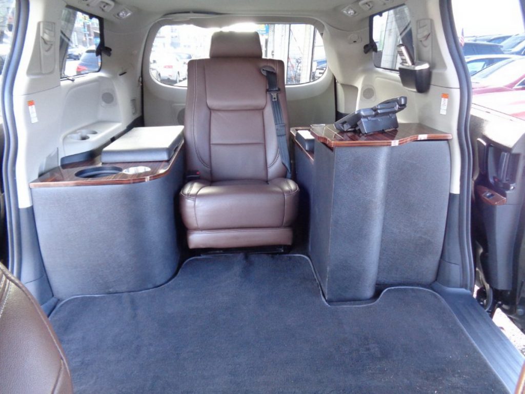 The office conversion means that the two captain’s chairs in the second row are now gone, creating a wide open space for easier access to the business end of the cabin. The single seat is positioned in the middle and is flanked by two custom cabinets; the one on the left hosts a mini-fridge while the one on your left features a slide-out table for you to place your laptop and a corded phone because apparently this is an office from the 1990s.