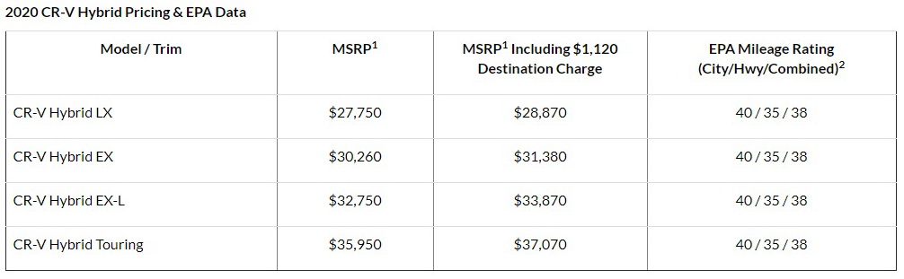 Prices for the new 2020 Honda CR-V Hybrid start from $28,870 for the base LX (including a $1,120 destination charge) and can reach up to $37,070 for the range-topping Touring model.