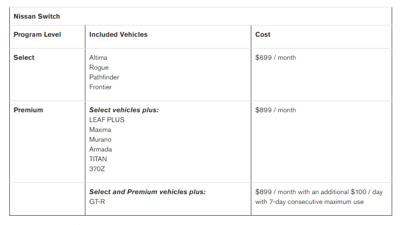 As for the main costs, you pay $699/month for an Altima, Rogue, Pathfinder or Frontier, $899/month for the LEAF Plus, Maxima, Murano, Armada, Titan, 370Z, or $899/month with an additional $100/day with 7-day consecutive maximum usage for the GT-R.