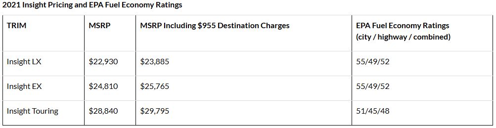 Pricing for the 2021 Insight starts from $22,930 as before, not taking into account the $955 destination and handling charges. Also, while Honda Sensing is standard on all trims, the aforementioned safety systems are only standard on EX and Touring specs.