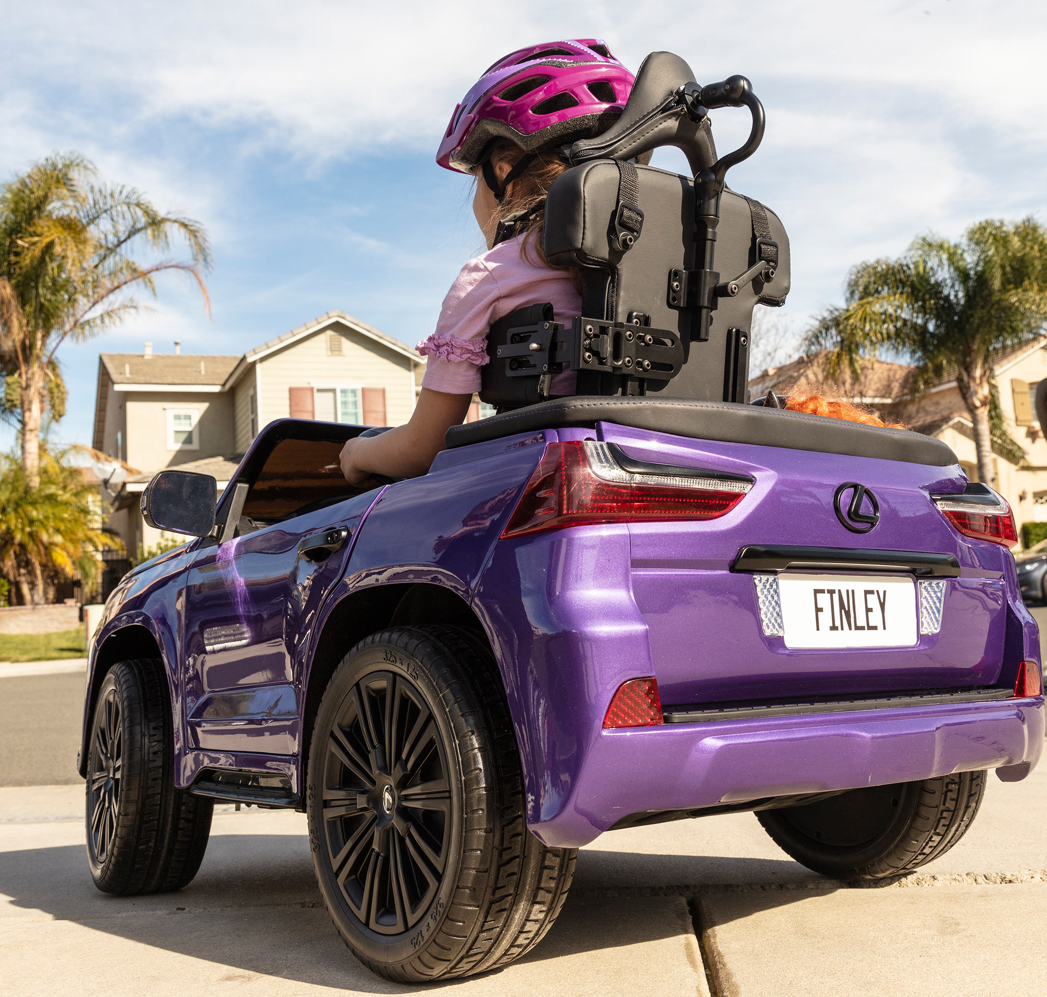 Modifications were also made to the Lexus’ controls. Typically, ride-on vehicles like this feature traditional pedals and a steering wheel but many children with cerebral palsy don’t have the strength to hold and turn a steering wheel. Consequently, a joystick has been added that allows Finley to control the direction of the vehicle and how quickly it accelerates. The car has also been painted purple, Finley’s favorite color.