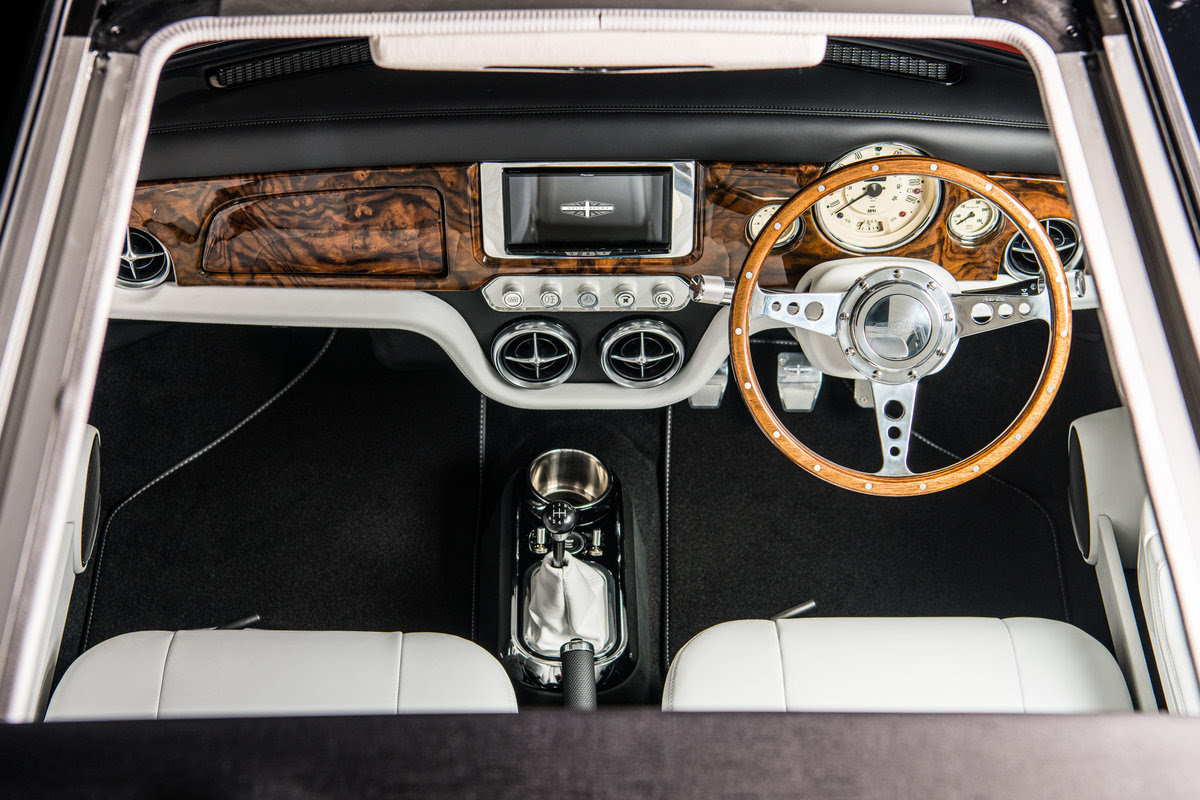 The Mini restomod features a wood veneer dash in ‘Dark American Burr Walnut’ with a gloss lacquer, ‘Arctic White’ leather upholstery and white Alcantara headlining. The beauty is in the details and those include ivory LED illuminated Smiths dials, ‘Day Tripper’ painted trim and a superb wood-rimmed steering wheel with aluminum spokes.