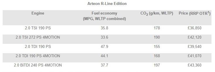 Prices for the new VW Arteon R-Line Edition kick off at £36,850 for the 2.0 TSI 190 PS petrol version and from £42,120 for the 2.0 TSI 272 PS 4MOTION model. The German carmaker also offers the diesel 2.0 TDI with either 190 PS or 240 PS and the option of all-wheel drive – or 4Motion in VW speak.