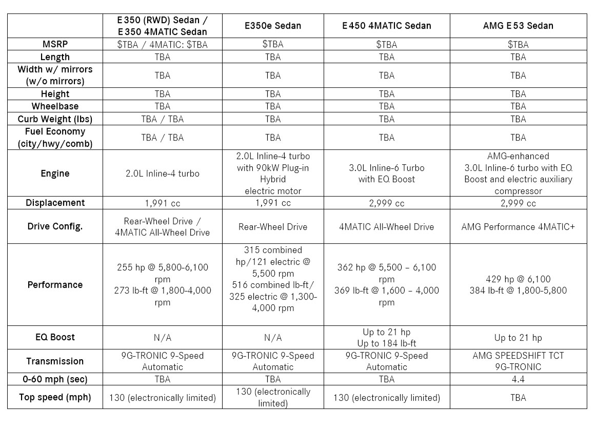 The U.S. will get the E350 with a 255 hp 2.0-liter turbo in both RWD and 4Matic AWD versions, the E350e PHEV with a 315 hp 2.0-liter turbo and an electric motor, and the E450 4Matic with the new 362 hp 3.0-liter straight-six turbo with EQ boost, alongside the AMG E53 with a 429 hp 3.0-liter inline-six with an electric auxiliary compressor. Sales of the sedan models will start in late 2020.