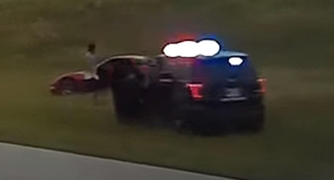 The Corvette then continued traveling through the grass before coming to a rest near an overpass. It’s unclear if the driver got stuck or simply decided to call it quits but, whatever the case, they were greeted by the pursuing officer.