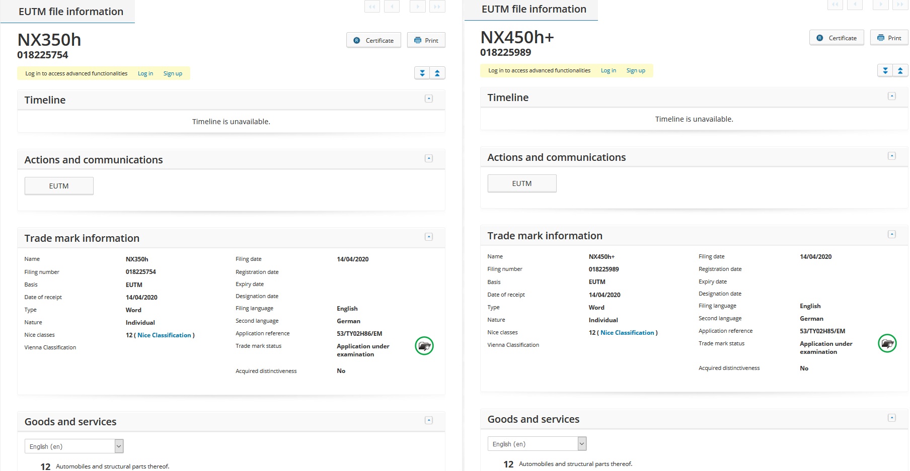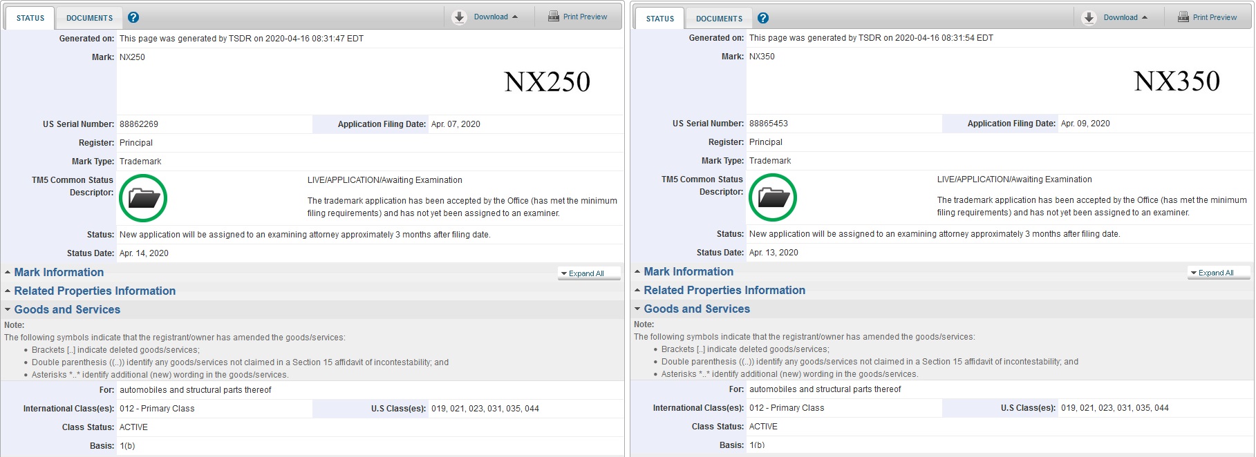 Another two monikers were filed as well, this time with the United States Patent and Trademark Office (USPTO). These are the NX250 and NX350, and are also marked as “automobiles and structural parts thereof”.