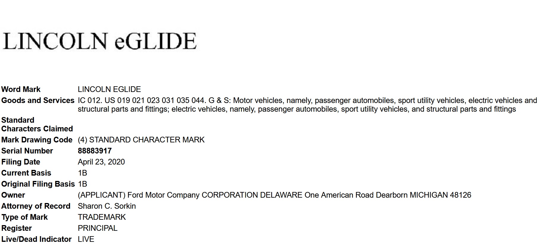 Lincoln has filed a trademark application with the United States Patent and Trademark Office (USPTO), looking to secure the eGlide moniker.