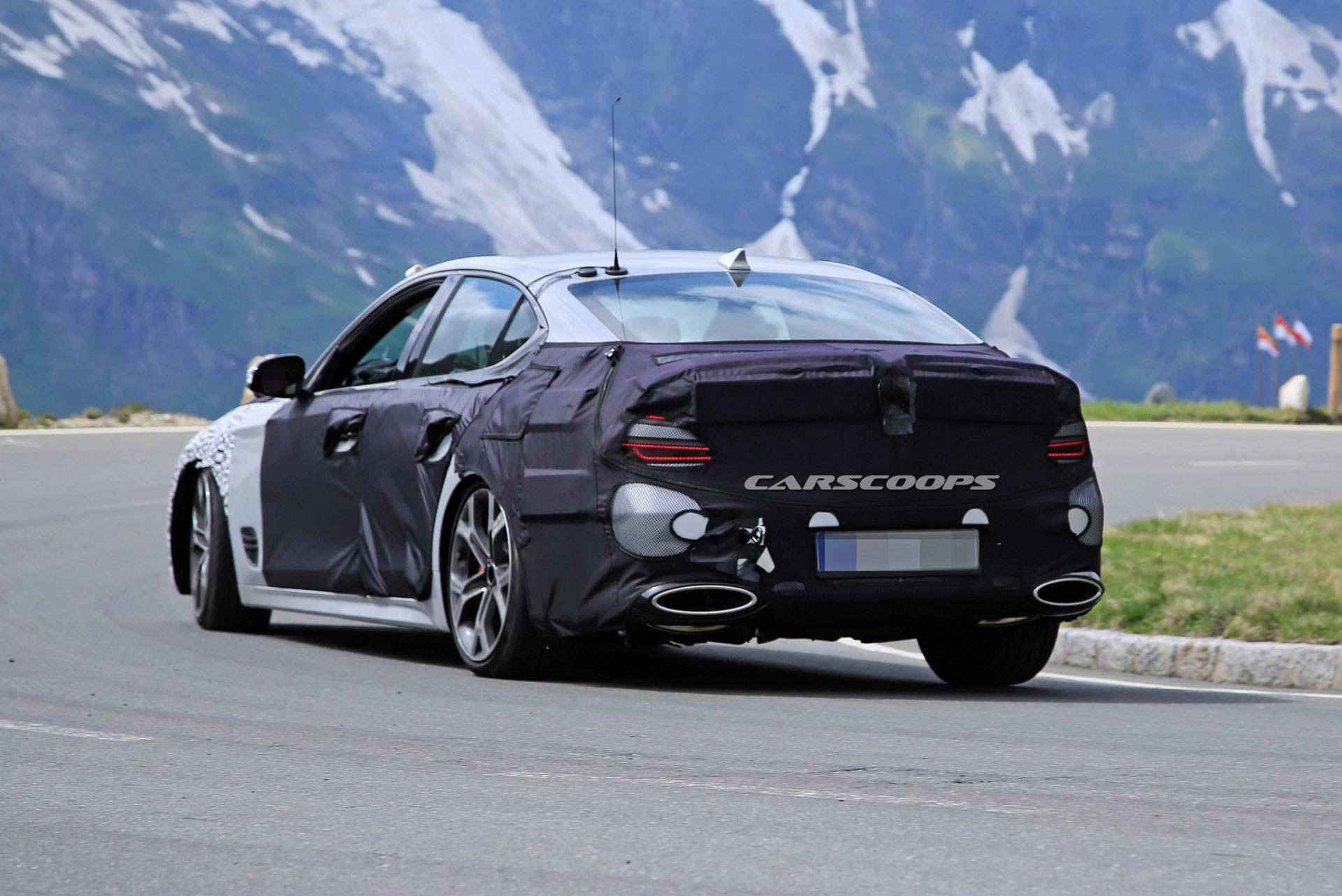While the rear end is heavily camouflaged, we can see a set of quad taillights peeking through. Designers also gave the car a ridiculously massive dual exhaust system with oval-shaped tips.