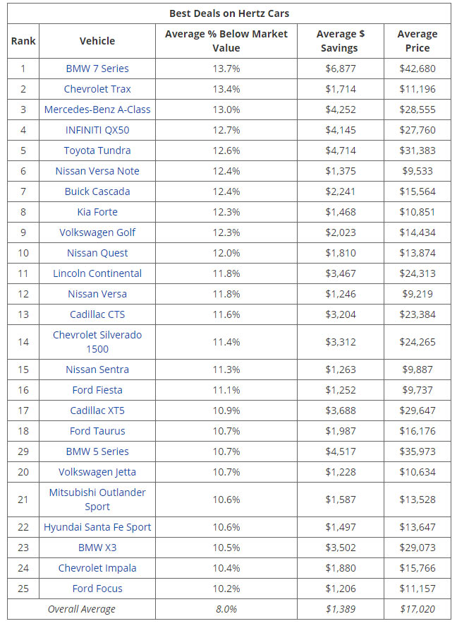 According to the results of the study, Hertz vehicles are typically priced 8.0% below market value for an average savings of $1,389. However, one model can be bought for $6,877 less than average.
