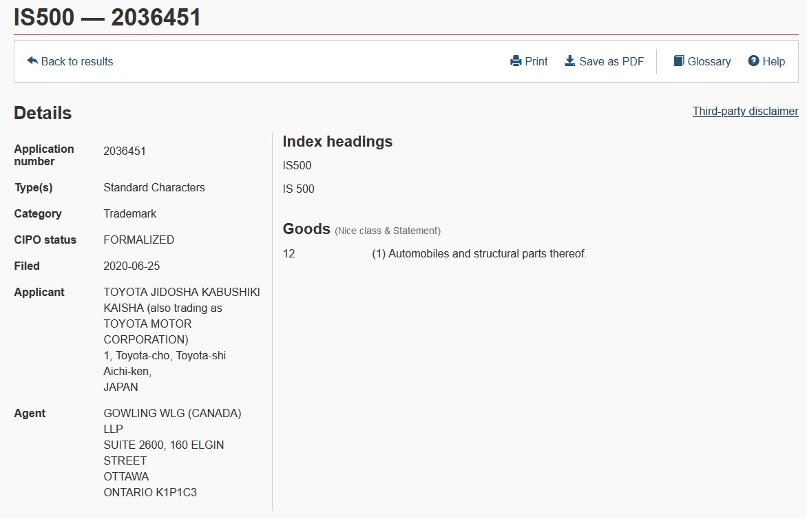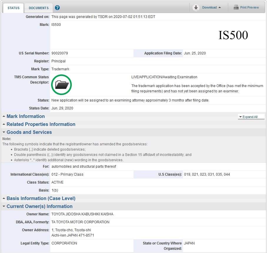They have already taken a first step in this direction by filing applications to secure the IS500 moniker in the United States and Canada on June 25. Discovered by GR86, it was still pending at the time of writing, yet it has met the minimum filing requirements.
