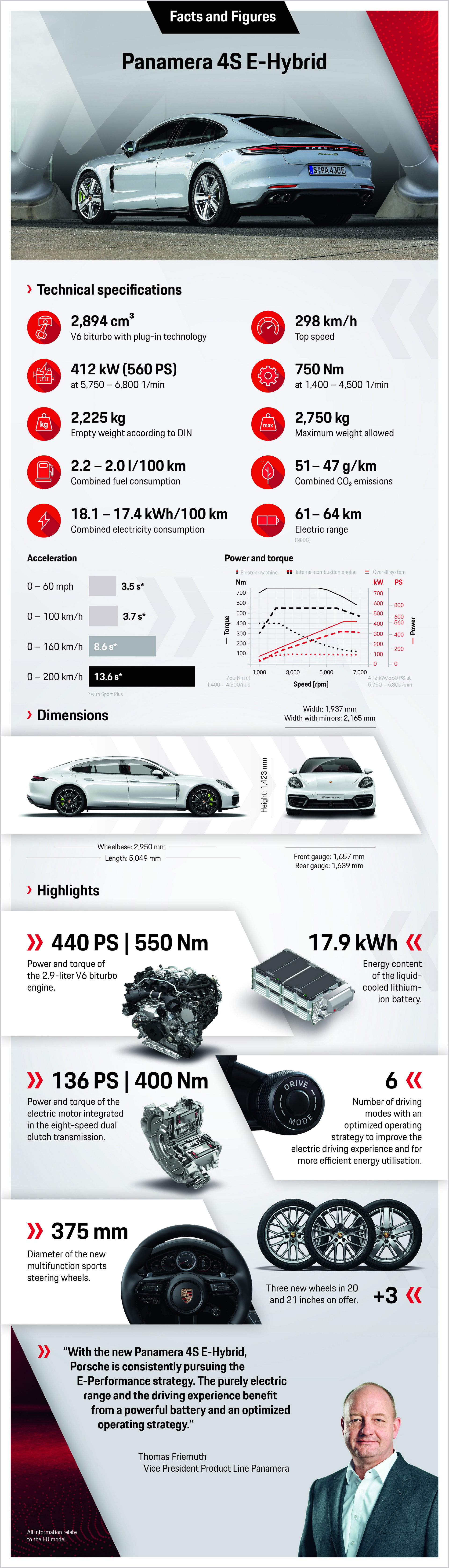 The plug-in hybrid lineup has welcomed a new model, the Panamera 4S E-Hybrid. It combines a 2.9-liter twin-turbo V6, making 434 HP (440 PS / 324 kW), with a 134 HP (136 PS / 100 kW) electric motor integrated into the eight-speed PDK transmission, for a total output of 552 HP (560 PS / 412 kW) and a peak torque of 553 HP (750 Nm). This variant covers the 0-62 mph (0-100 km/h) sprint in 3.7 seconds and can reach a top speed of 185 mph (298 km/h). It has a 34–mile (54-km) driving range in the WLTP cycle with the 17.9 kWh battery fully charged.