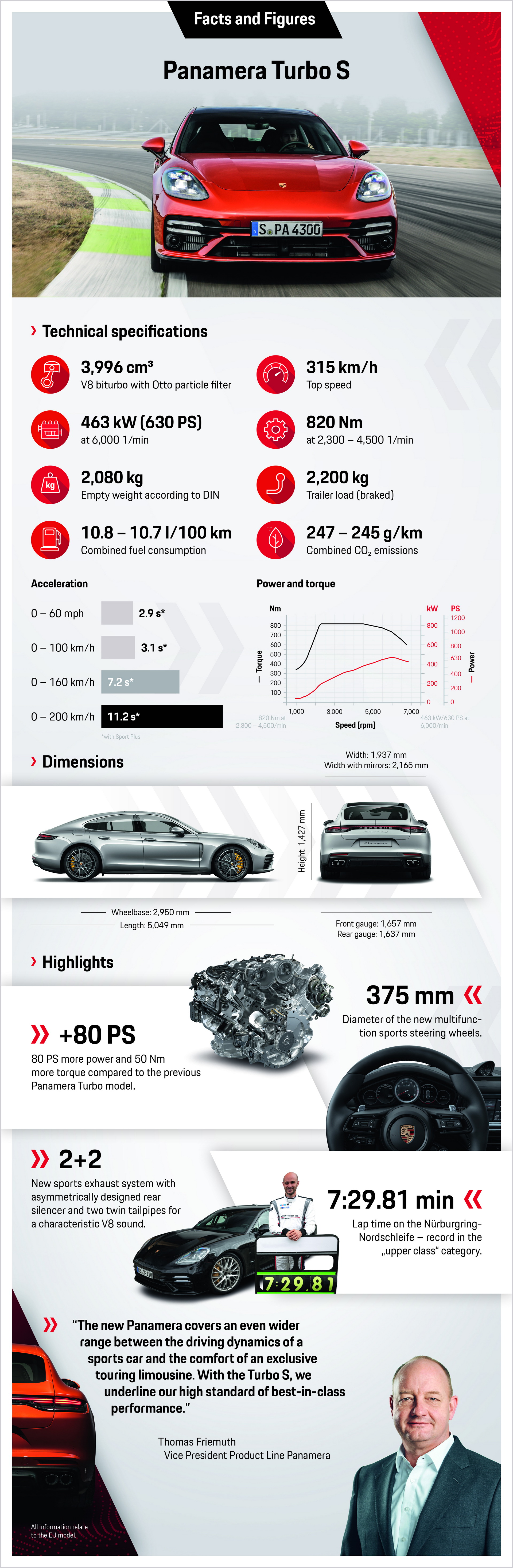 The 2021 Panamera Turbo S, which is the Nurburgring Nordschleife record holder for executive cars beating the Mercedes-AMG GT 63 by 0.3 seconds, accelerates from nought to 62 mph (0-100 km/h) in just 3.1 seconds and tops out at 196 mph (315 km/h). The combined fuel consumption is 21.2-22 mpg US (11.1-10.7 l/100 km) and CO2 emissions stand at 245-253 g/km.