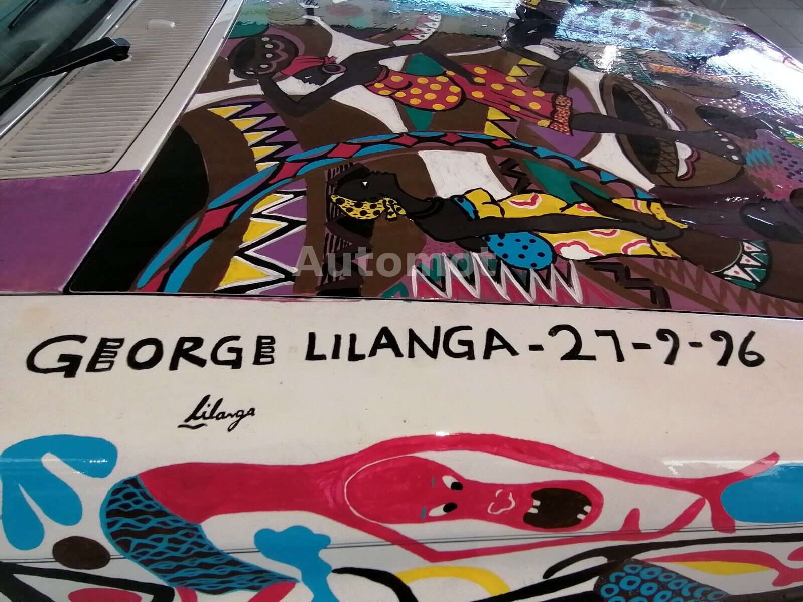 Transformed into an art car by the late Tanzanian artist George Lilanga in September of 1996, after he apparently agreed to hand-paint it in return for sleeping a few nights in a German hotel for free, it’s a one-of-a-kind piece, and supposedly the only thing on four wheels that bears his signature.