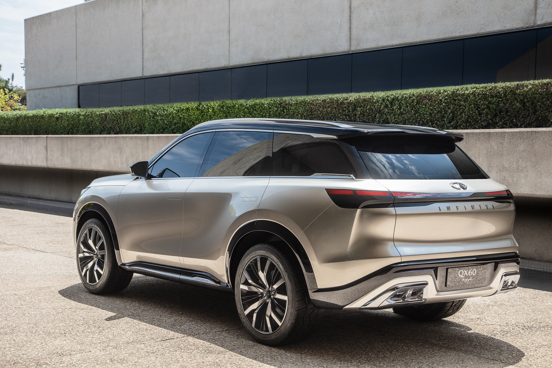 The tinted taillights look full-width, but are separated by a small black section. When the lights are off, Infiniti says they appear to “wrap around the back of the vehicle and into the rear flanks in one continuous shape.”