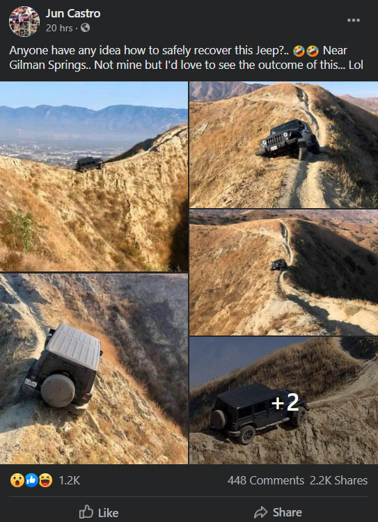 Images recently shared to the Hemet Eye News page on Facebook show a black, four-door Wrangler sitting precariously on a ridgeline, seemingly abandoned. This particular ridgeline appears to from part of the West Ridge trail near the town of Loma Linda and overlooking the San Bernardino Valley.
