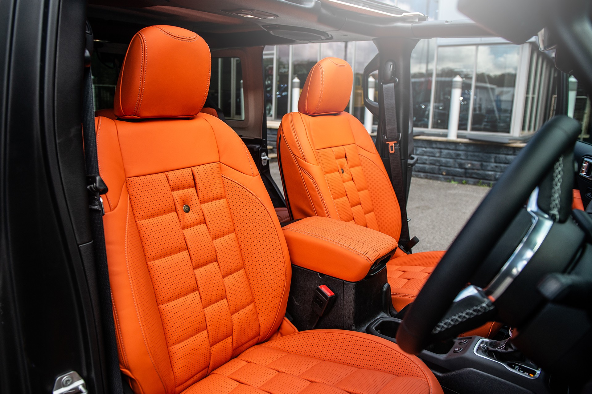 As rugged as it may appear on the outside, the cockpit is actually very lively. The bespoke touch is provided by the orange quilted leather, which has been applied to the seats, center and door armrests and glove box and is complemented by machined aluminum vented pedals and sill plates.