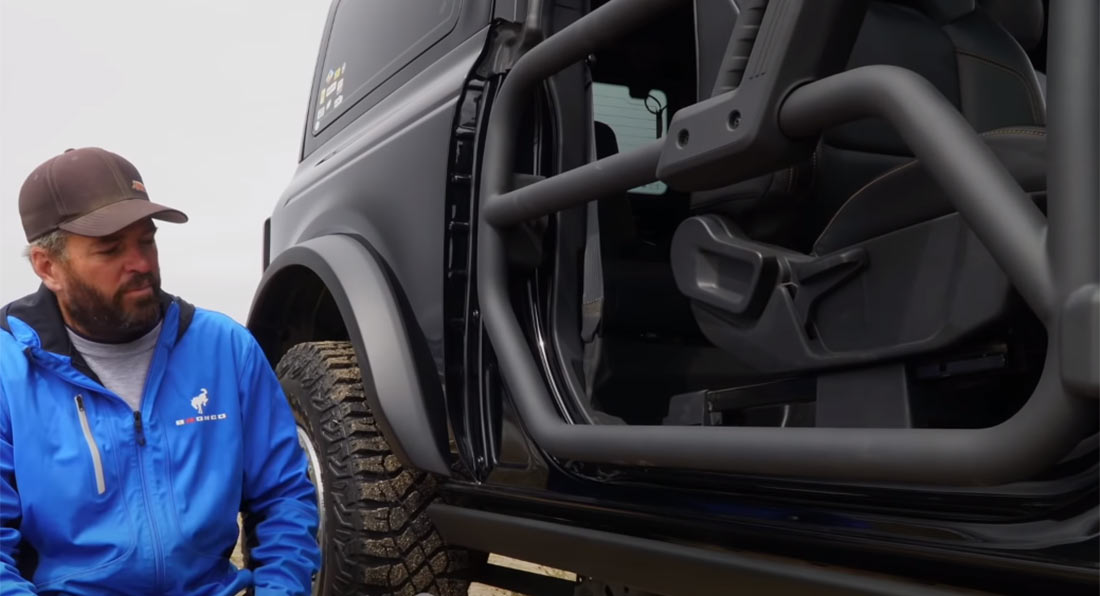 Beyond the doors, the presenter discusses other key aspects of the new Bronco. For example, he highlights the rugged rock rails that are mounted to the vehicle’s body rather than its frame, as well as its independent front suspension and the available beadlock-capable wheels with 35-inch off-road tires.