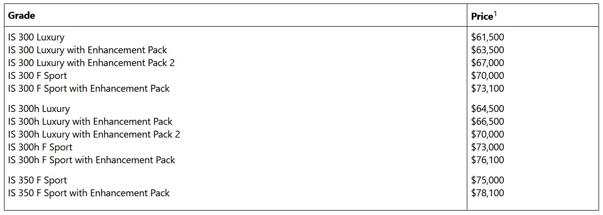 The lineup includes the IS 300 Luxury, IS 300 F Sport, IS 300h Luxury, IS 300h F Sport and IS 350 F Sport, with pricing starting at AU$61,500 (US$44,077).